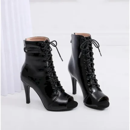 Women’s Black Lace-Up Peep-Toe Dance Boots with Stiletto Heel, Stylish High Heels for Ballroom and Latin Dance 2025