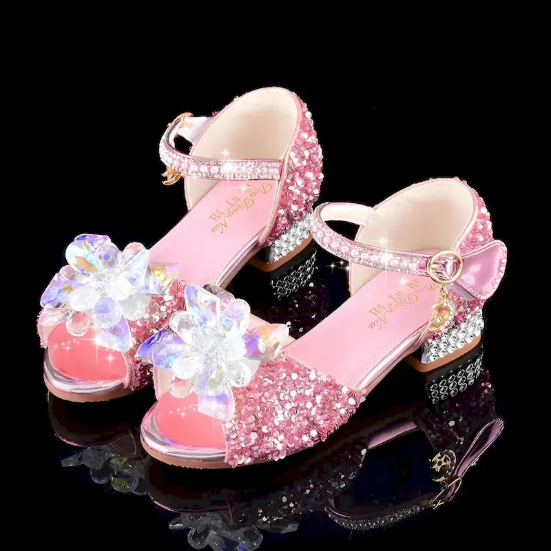 Girls’ Glittery Flower Crystal Shoes – Rhinestone Open-Toe Dress Shoes with Low Heels for Parties or Weddings 2025