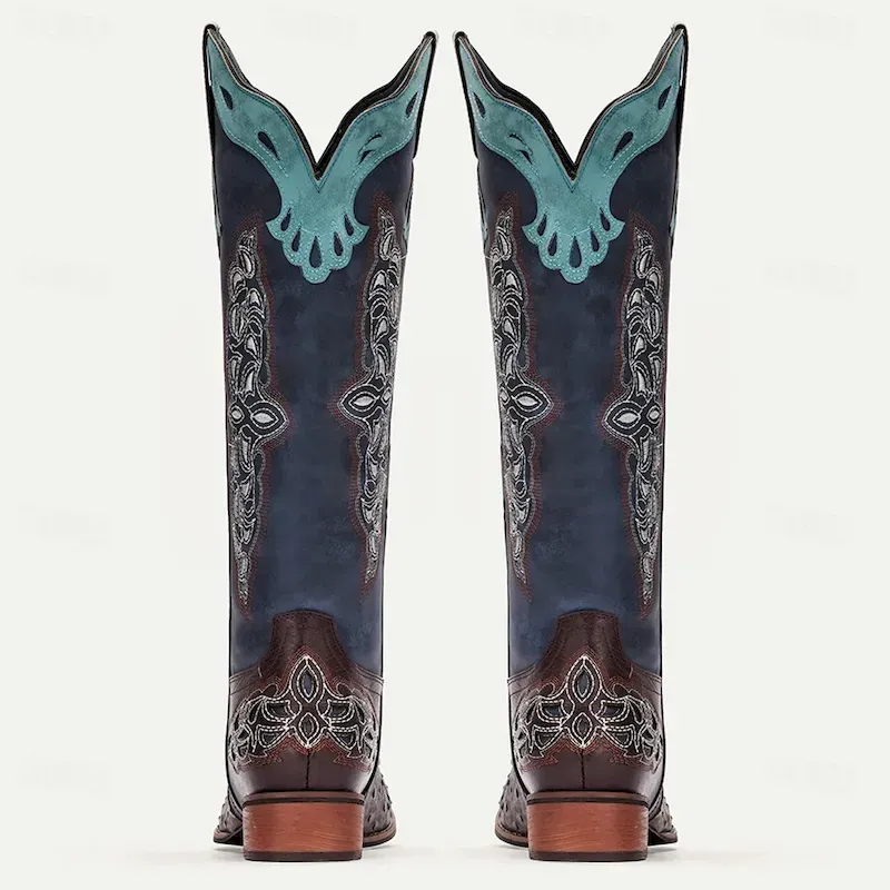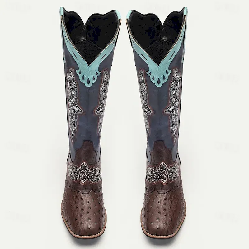 Men’s Vintage Western Cowboy Boots with Intricate Embroidery and Ostrich Print – Stylish Mid-Calf Design for Rodeo, Festivals, and Casual Wear 2025