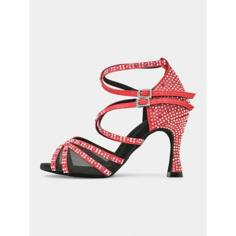 Red Rhinestone-Studded Latin Dance Sandals with Buckle Detail – Perfect for Social Dance, Competitions, and Performances 2025