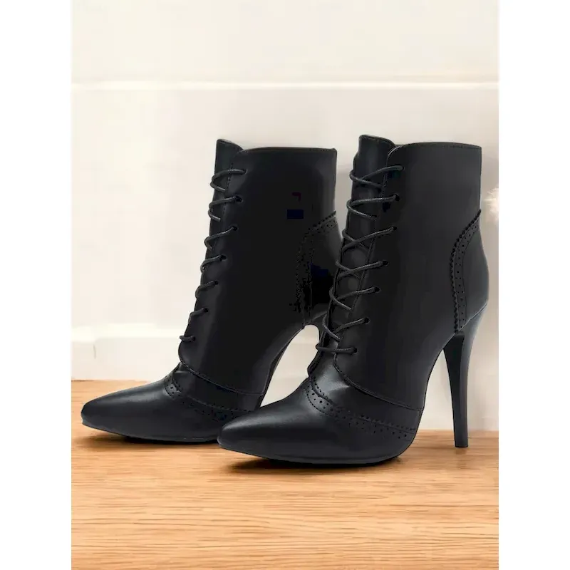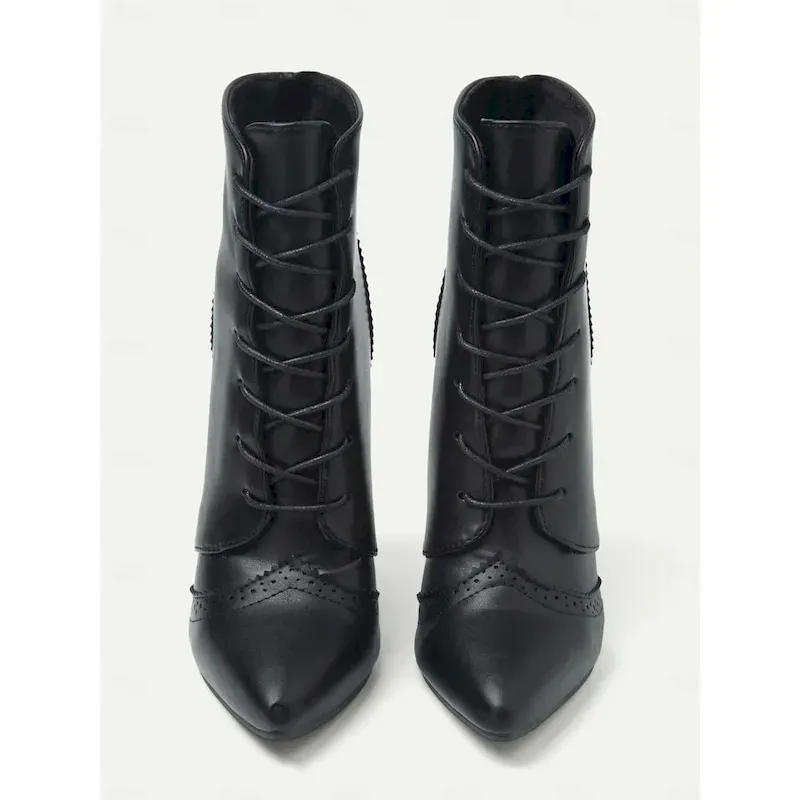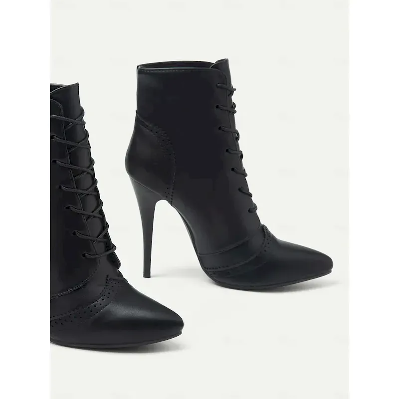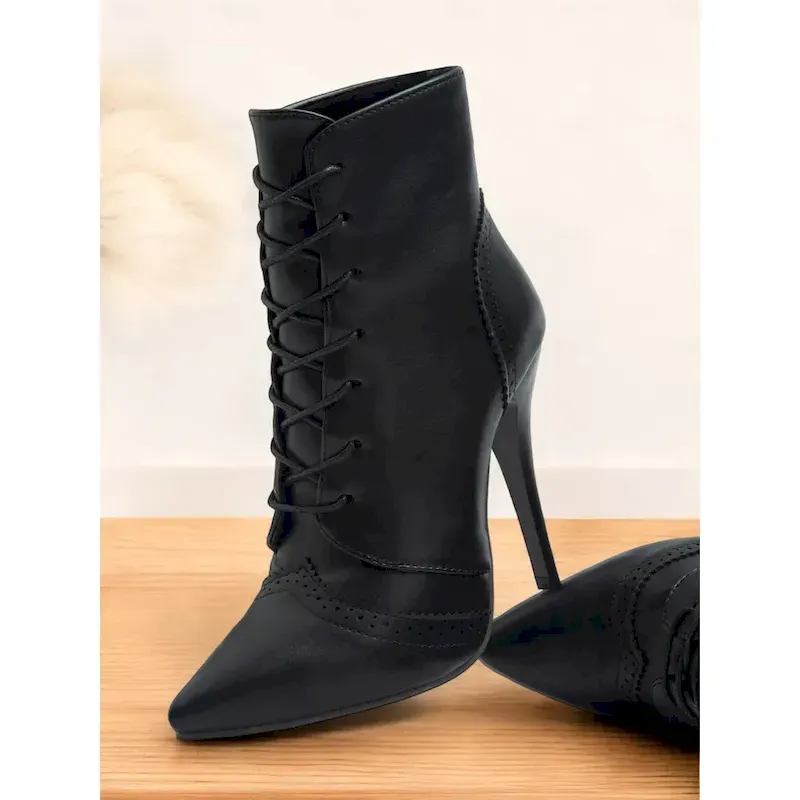 Women’s Black Lace-Up Stiletto Ankle Boots with Brogue Detailing – Gothic Witch Shoes for Halloween and Cosplay 2025