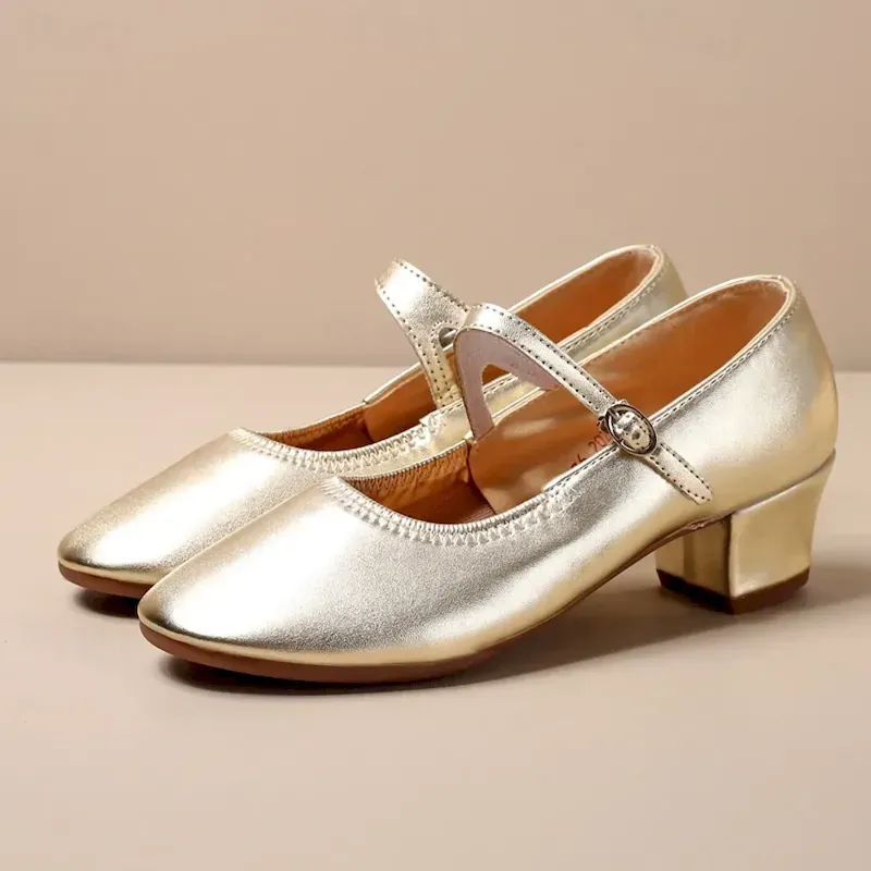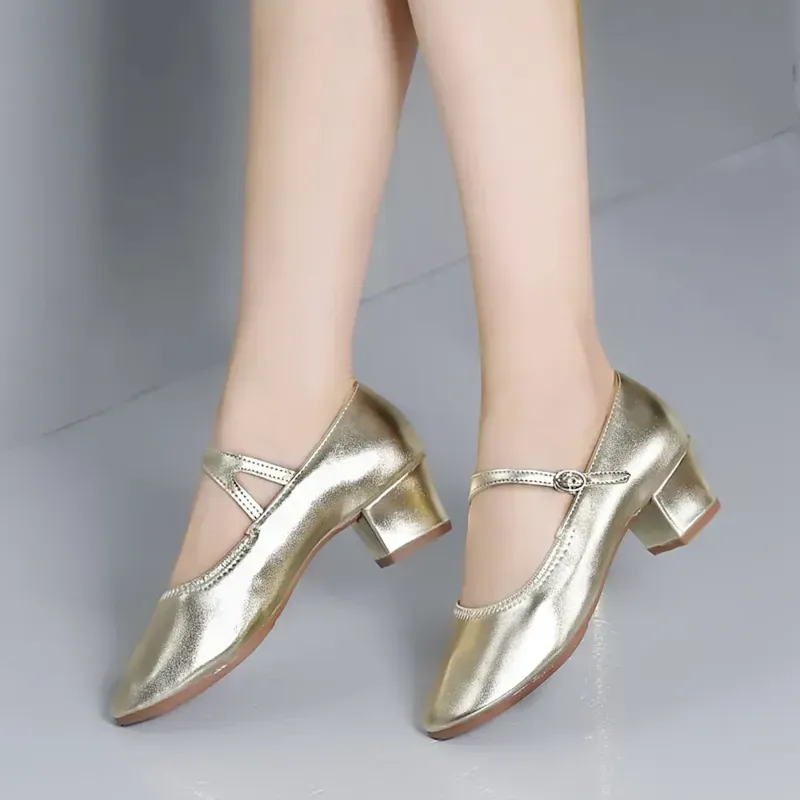 Women’s Gold Low Heel Mary Jane Dance Shoes with Buckle Strap, Shiny Soft Faux Leather Ballroom Pumps for Latin Practice, Wedding, and Stage Performan