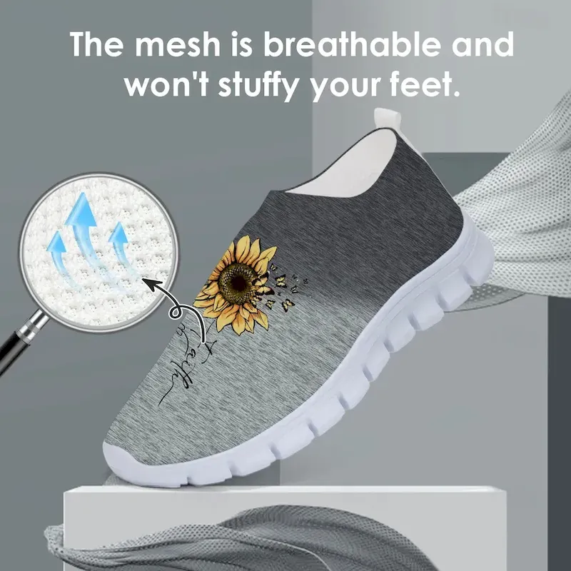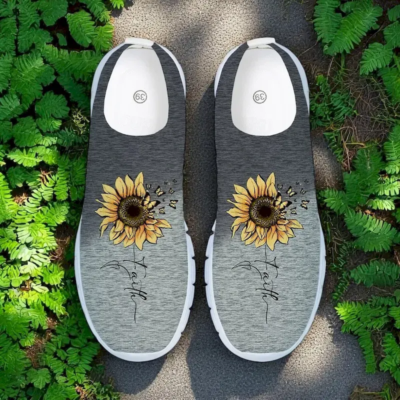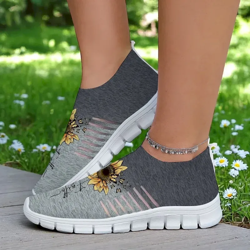 Women’s Gray Fly-knit Slip-On Sneakers with Sunflower Print – Lightweight Casual Walking Shoes for Travel, Daily Wear and Spring Outings 2025