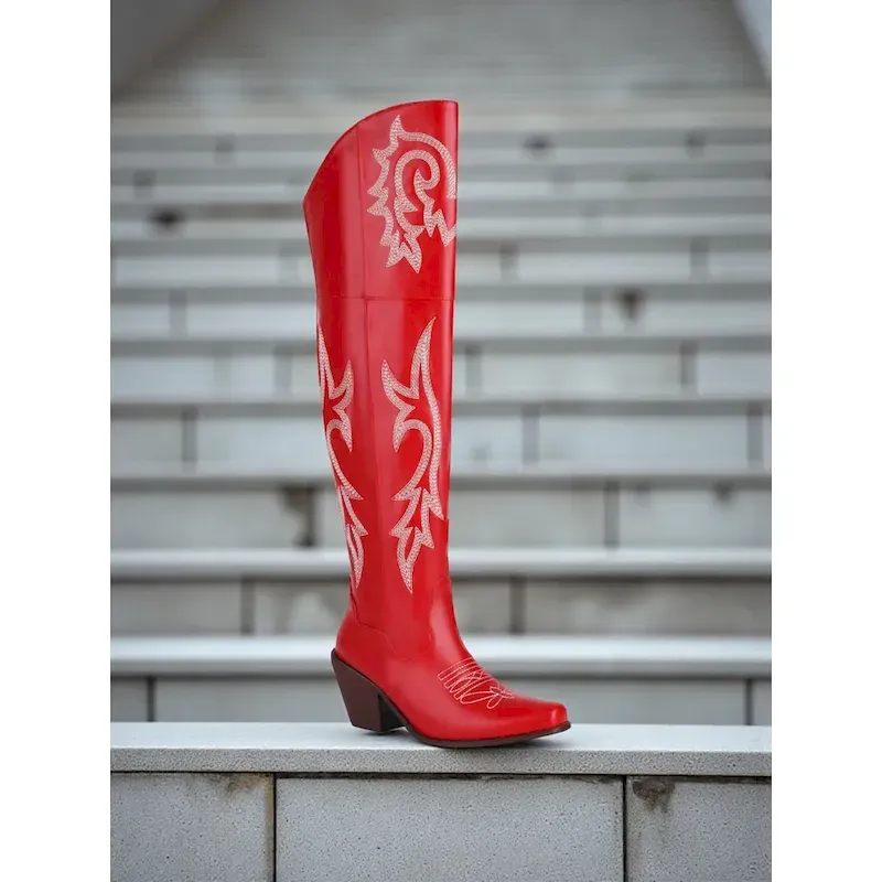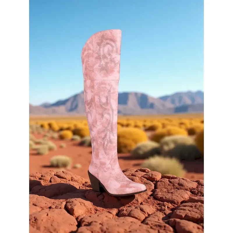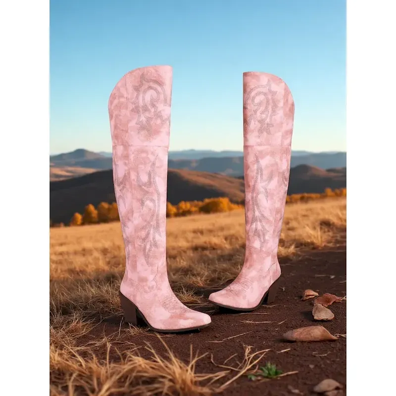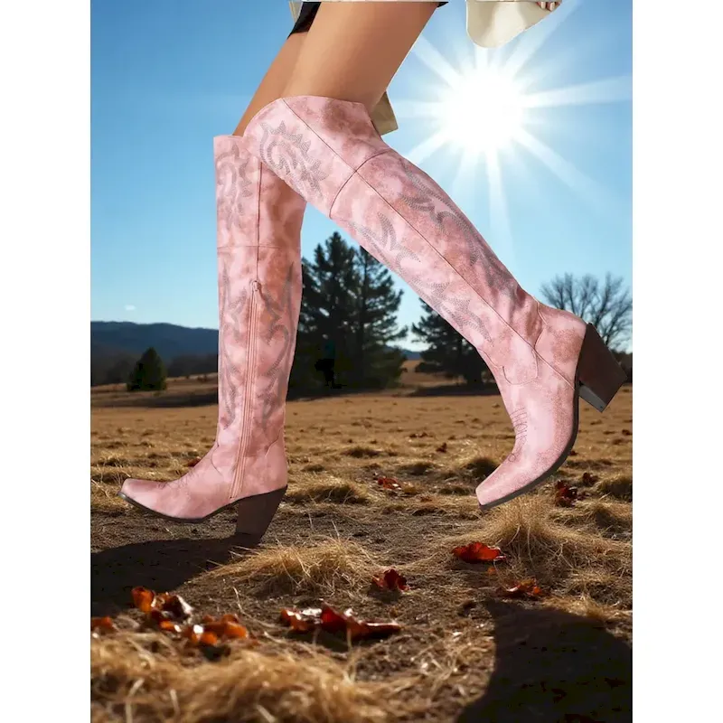 Women’s Pink Suede Embroidered Over – The – Knee Cowboy Boots, Western – Inspired Style for Urban Fashionistas, Perfect for Trendy City Outfits and Ca