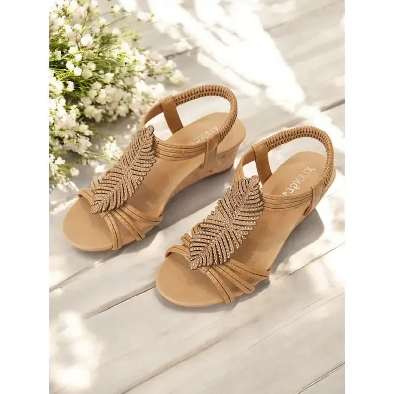 Women’s Rhinestone Leaf Wedge Sandals – Boho Style Elastic Slingback Summer Shoes for Casual, Beach, or Vacation Wear 2025
